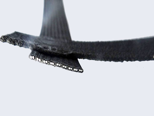 钢塑土工格栅以钢丝(或其纤维),经特殊处理,与聚乙烯(PE),并添加其助剂,通过挤出使之成为复合型抗拉条带,且表面有粗糙压纹,则为加筋土工带。由此单带,经纵、横按一定间距编制或夹合排列,采用特殊强化粘接的熔焊技术焊接其交接点而成型,则为加筋土工格栅。