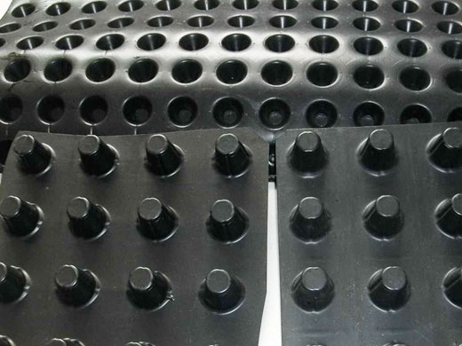 排水板是由聚苯乙烯(HIPS)或者是聚乙烯(HDPE)塑胶底板经过冲压制成圆锥突台或者加劲肋的凸点(或中空圆柱形多孔)而成,幅宽有3米,长度有10米或者是15米。